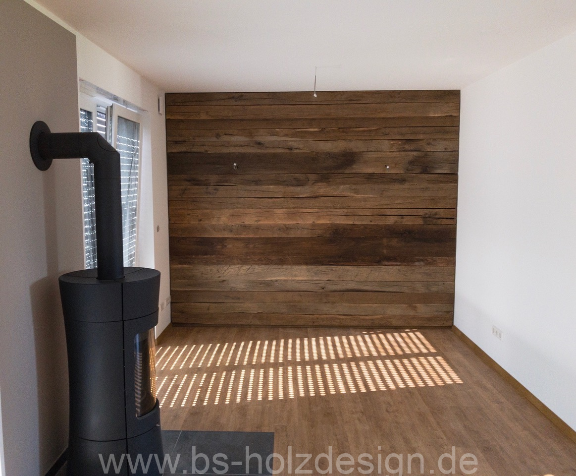 Wandverkleidung im Wohnzimmer mit Eiche Altholz gehackt: