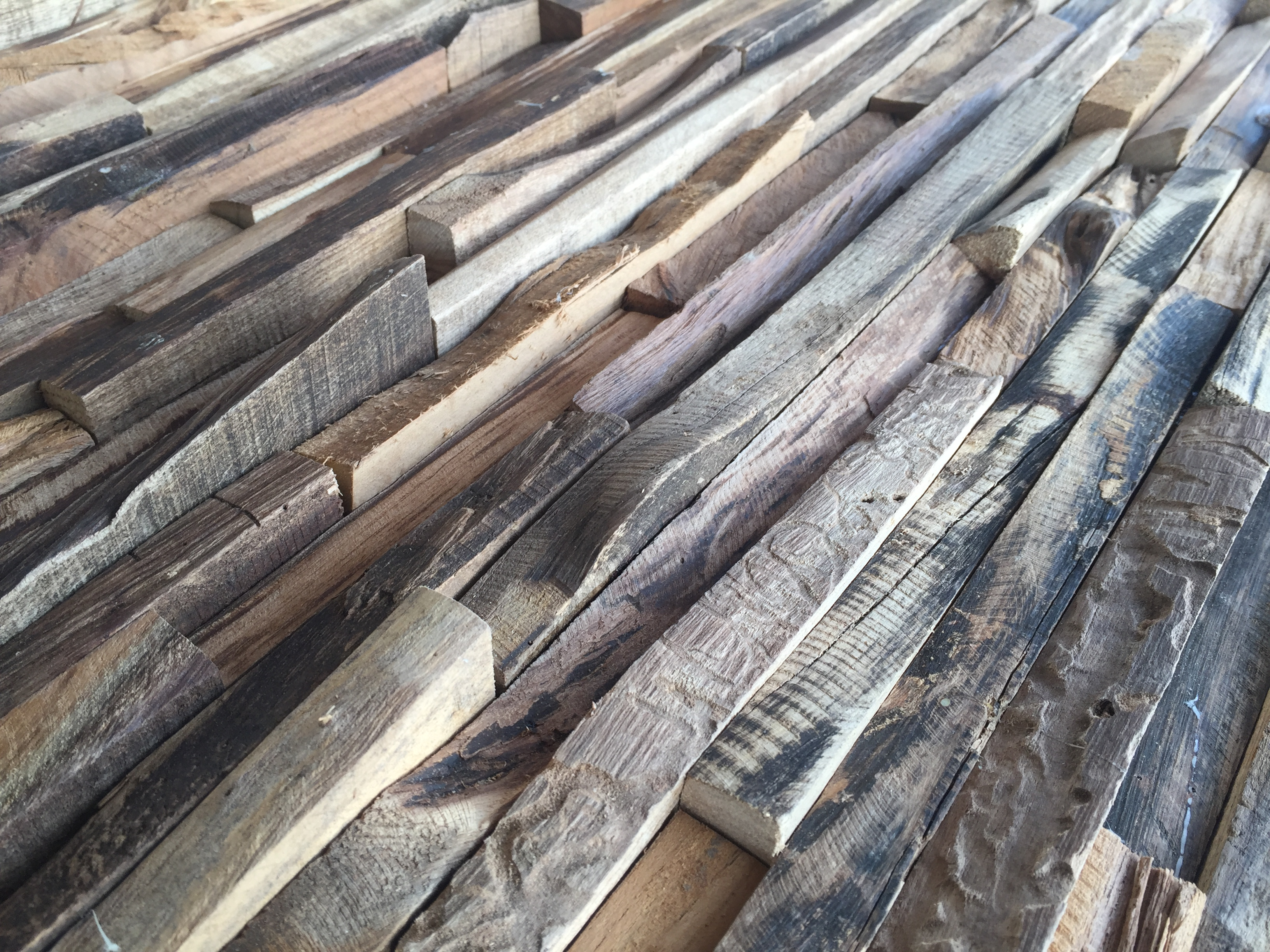 Die Paneele aus Teak und Nussbaum wirken durch die Verarbeitung der Baumkante des Baumes natürlicher und rustikaler und manchen Augen schöner. Kante ist stufig verzahnt, damit die einzelnen Elemente in der fertigen Wandfläche nicht auffallen. Von hellen Stäben über Ansätze von Ästen bzw. zum dunklen Stück der Rinde ist alles vertreten. Foto Aufnahmen teilweise in der Sonne.